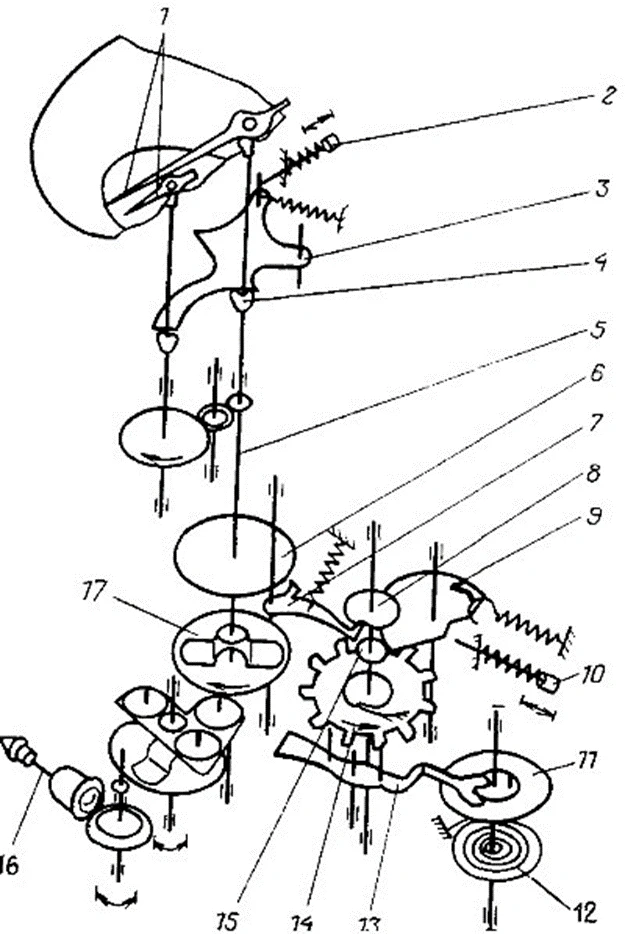 Схема тахометра ТЧ 10-Р: 1. стрелки; 2. кнопка; 3. молоток; 4. сердечки возврата стрелок в нулевое положение; 5. ось; 6. храповое колесо; 7. храповой рычаг; 8. кулачок; 9. сектор; 10. кнопка "Пуск"; 11. баланс; 12. волосок; 13. анкерная вилка; 14. анкерное колесо; 15. триб анкерного колеса; 16. вал тахометра; 17. колесо.