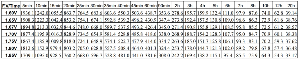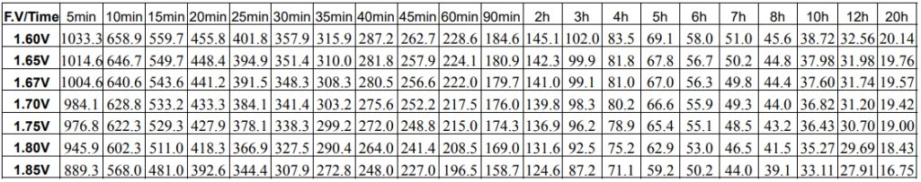 Разряд постоянной мощностью на ячейку (Watts at 25°C)