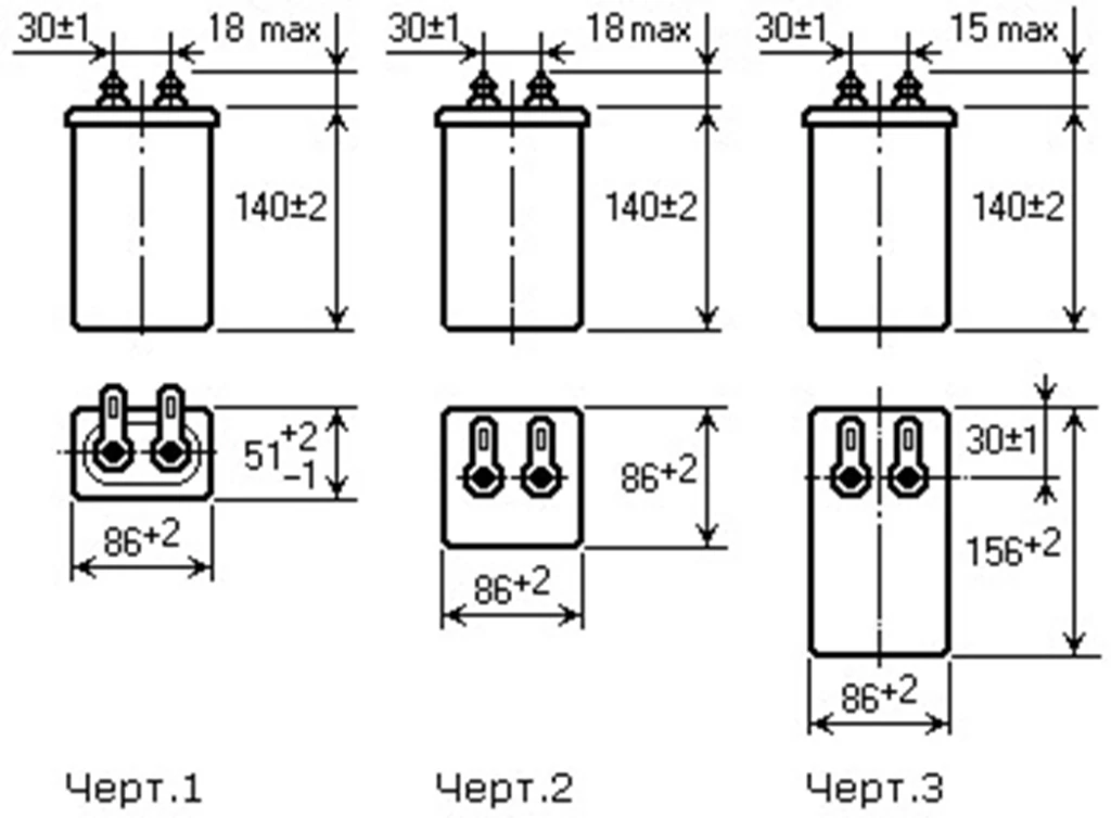 Диапазон ёмкостей, номинальные напряжения и масса конденсаторов приведены в таблице,габаритные размеры указаны на чертежах.