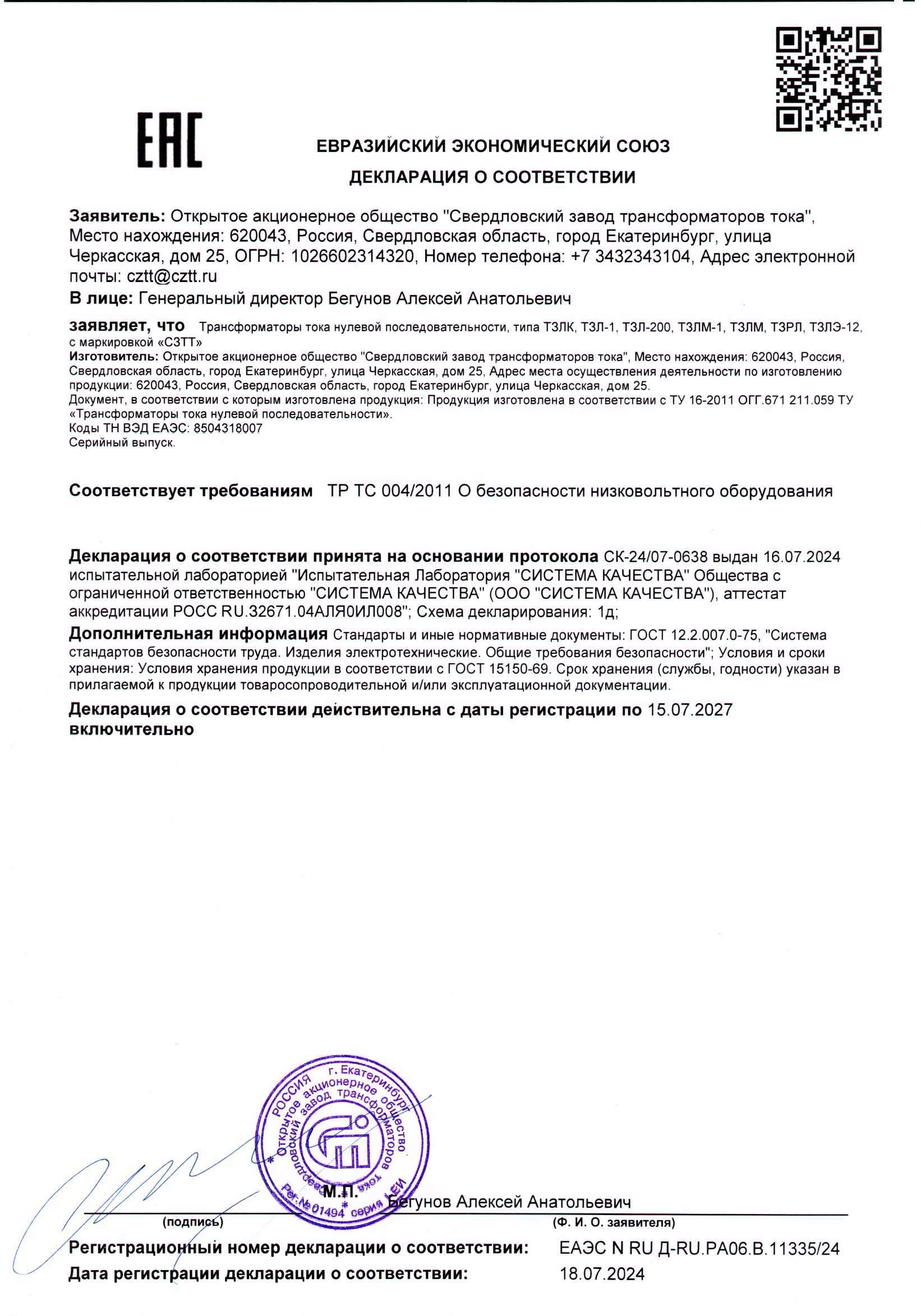 Трансформаторы тока нулевой последовательности ТЗЛ-200 с коэффициентом трансформации 60/1 предназначены для питания схем релейной защиты от замыкания на землю отдельных жил трехфазного кабеля путем трансформации возникших при этом токов нулевой последовательности и устанавливаются непосредственно на кабель. Также трансформаторы ТЗЛ предназначены для установки в комплектные распределительные устройства (КРУ). Такие трансформаторы изготавливаются в климатическом исполнении "У" категории размещения 2 по ГОСТ 15150 и могут эксплуатироваться в следующих условиях: