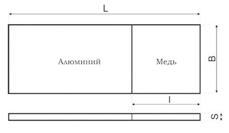 Пластины переходные медно-алюминиевые МА изготавливаются из двух металлов по технологии ударно-стыковой сварки по ГОСТ 19357-81 и предназначены для присоединения алюминиевых шин к медным выводам электротехнических устройств или медным шинам для исключения электрохимической коррозии из-за разницы потенциалов меди и алюминия.