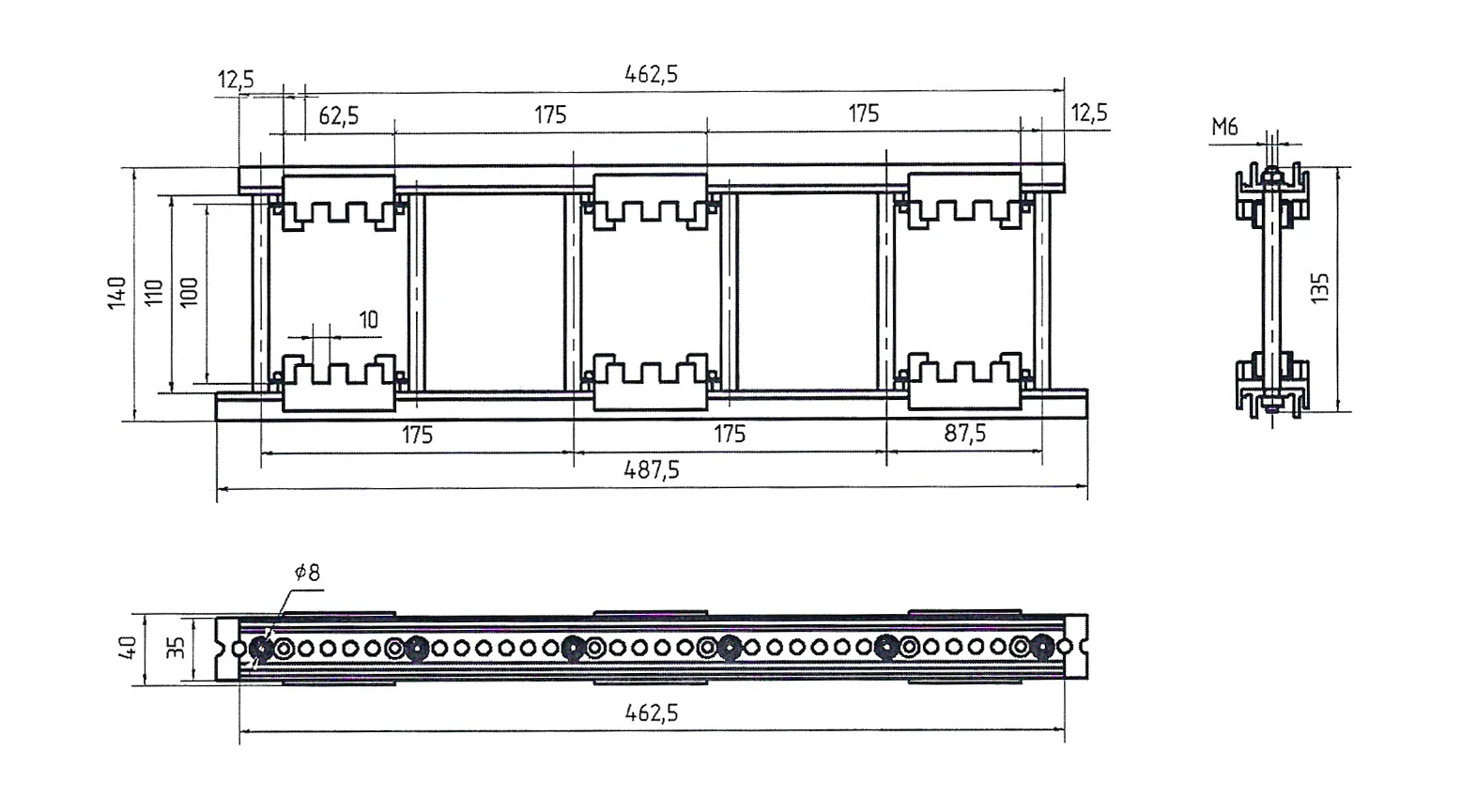 Шинодержатель ШН-10х100-2-3-175-П1-УХЛ3 - шинодержатель наборный с полной комплектацией и с одинарными рейками, который предназначен для закрепления плоских токоведущих шин в электроустановках различного назначения и организации шинных трасс на напряжение до 1000 В переменного тока частотой 50, 60 Гц.