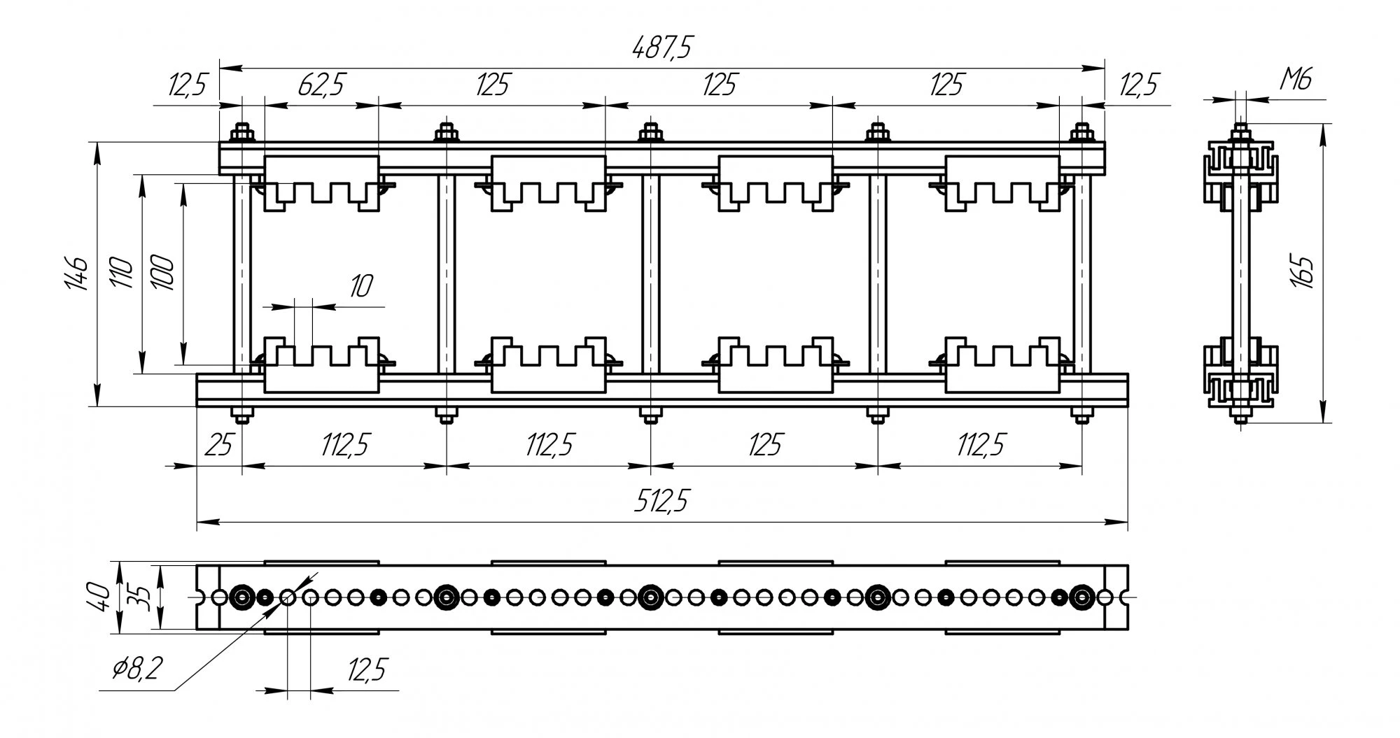 Шинодержатель ШН-10х100-2-4-125-П2-УХЛ3 - шинодержатель наборный с полной комплектацией и с двойными рейками, который предназначен для закрепления плоских токоведущих шин в электроустановках различного назначения и организации шинных трасс на напряжение до 1000 В переменного тока частотой 50, 60 Гц.