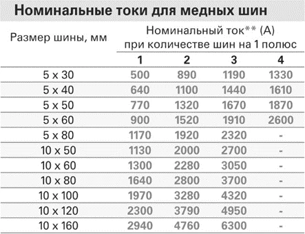 ** Для медных шин, расположенных горизонтально, при температуре окружающей среды 35 °С и температуре шин 85 °С