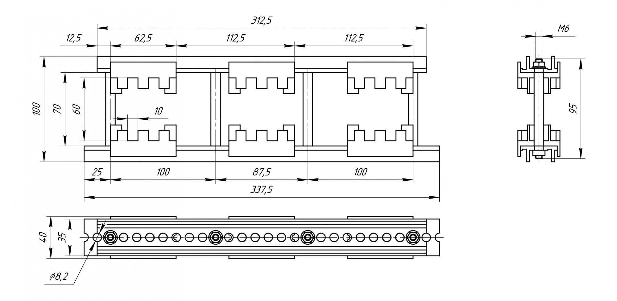Шинодержатель ШН-10х60-2-3-112,5-Н1-УХЛ3 - шинодержатель наборный с неполной комплектацией и с одинарными рейками, который предназначен для закрепления плоских токоведущих шин в электроустановках различного назначения и организации шинных трасс на напряжение до 1000 В переменного тока частотой 50, 60 Гц.
