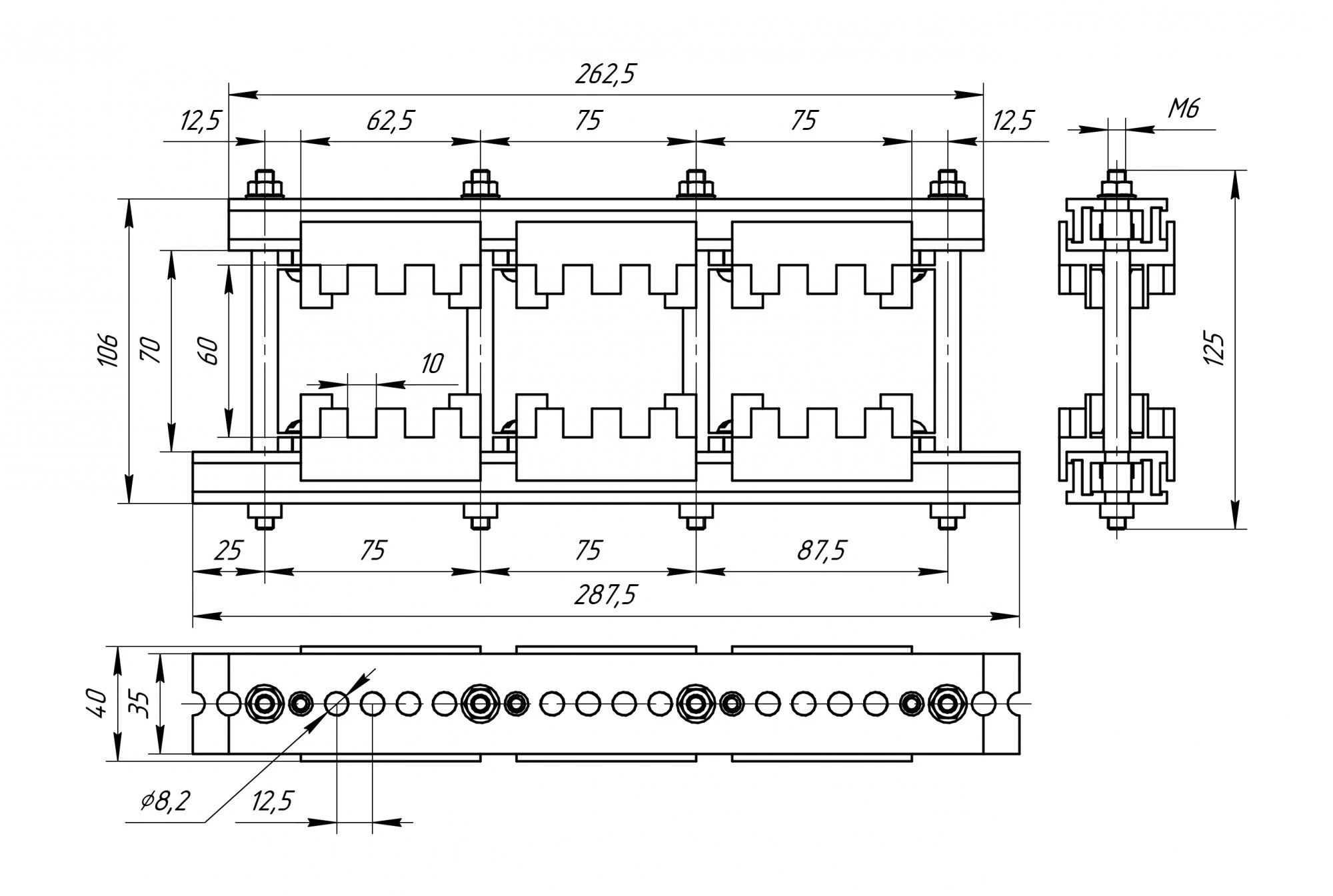 Шинодержатель ШН-10х60-2-3-75-П2-УХЛ3 - шинодержатель наборный с полной комплектацией и с двойными рейками, который предназначен для закрепления плоских токоведущих шин в электроустановках различного назначения и организации шинных трасс на напряжение до 1000 В переменного тока частотой 50, 60 Гц.