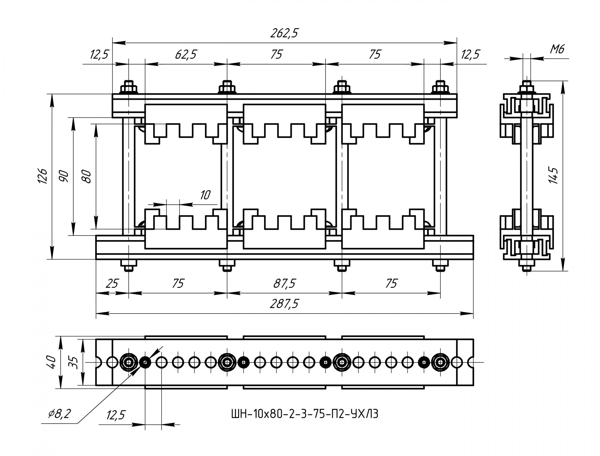 Шинодержатель ШН-10х80-2-3-75-П2-УХЛ3 - шинодержатель наборный с полной комплектацией и с двойными рейками, который предназначен для закрепления плоских токоведущих шин в электроустановках различного назначения и организации шинных трасс на напряжение до 1000 В переменного тока частотой 50, 60 Гц.